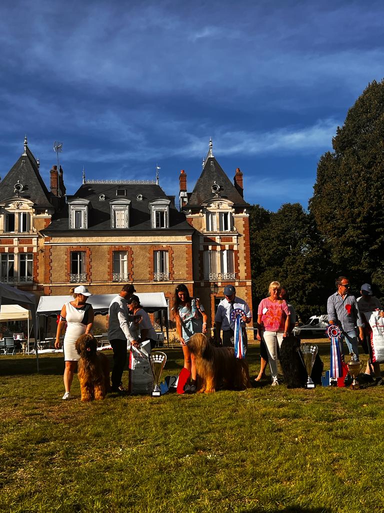 Die Nationale Ausstellung im Mutterland der Briard muss man einmal erlebt haben. La Bussière, im Herzen von Frankreich, war der Austragungsort der diesjährigen Ausstellung. Vor imposanter Kulisse mit Schloss wurde an zwei Tagen die Hunde auf Charakter und Aussehen getestet. Am Samstag wurde die Hündinnen und am Sonntag die Rüden gerichtet. Beim Wesenstest hat Rochat das maximum an Punkten erreicht. Der Test umfasst mehrere Teile mit Schusswaffen, Bedrohung, Ablenkung und mehr. Sie hat alles souverän gemeistert und konnte so die Richter von sich überzeugen. Ihr Halbbruder machte es ihr einen Tag später nach. Dies zeugt von einer gesunden Zucht aus dem Hause Holzer!