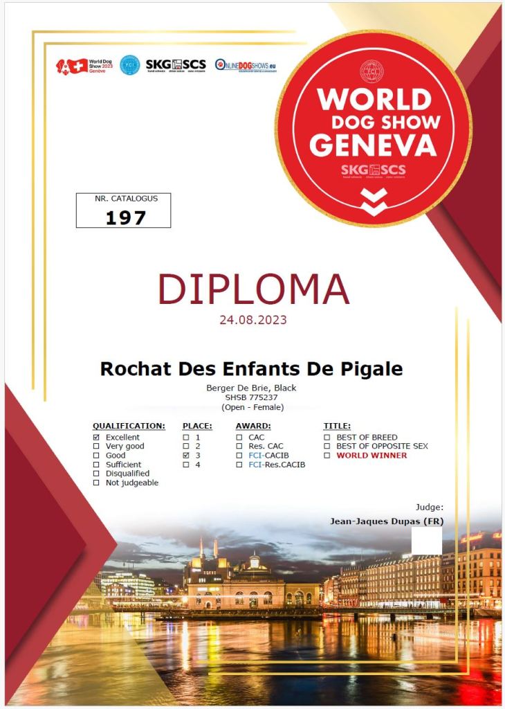 Ein wohl einmaliges Ereignis für uns. Die Welthundeausstellung in Genf war für uns alle etwas neues. Mehr als 10`000 Hunde wurde in der Palexpo Halle vorgeführt. Rochat wurde an 3 Tagen ausgestellt und hatte wie schon immer von Tag zu Tag weniger Spass. Die Hitze auf dem „Camping“ (Parkplatz des Flughafens) war unglaublich. Ein Dank hier an Micha Werren, das wir seine Klimaanlage ausleihen durften. Für die Hunde war das mehr als praktisch wenn nicht sogar Lebensnotwendig! Rochat hat sich wie immer sehr gut aufgeführt im Ring. An der World Dog Show erhielt Rochat ein Excellent und wurde dritte in ihrer Kategorie. Danke Anne für deine Hilfe bei der Ausstellung!